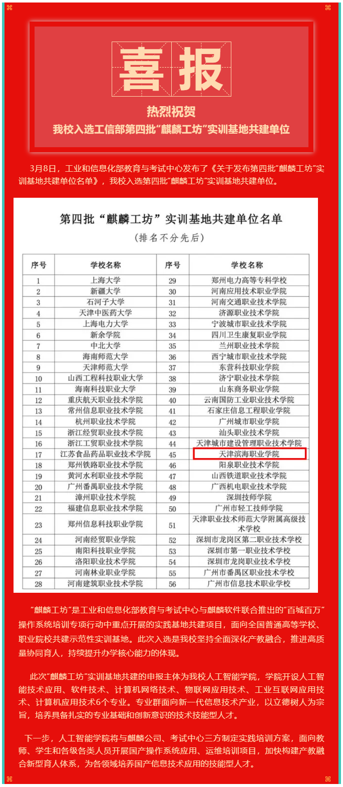 喜报!必赢官网入选工信部第四批“麒麟工坊”实训基地共建单位 来源:本站原创 发布时间:2024-03-18 11:38:26 浏览次数: 次 【字体:小 大】 终审:rgznxysh2 分享到: 【打印正文】