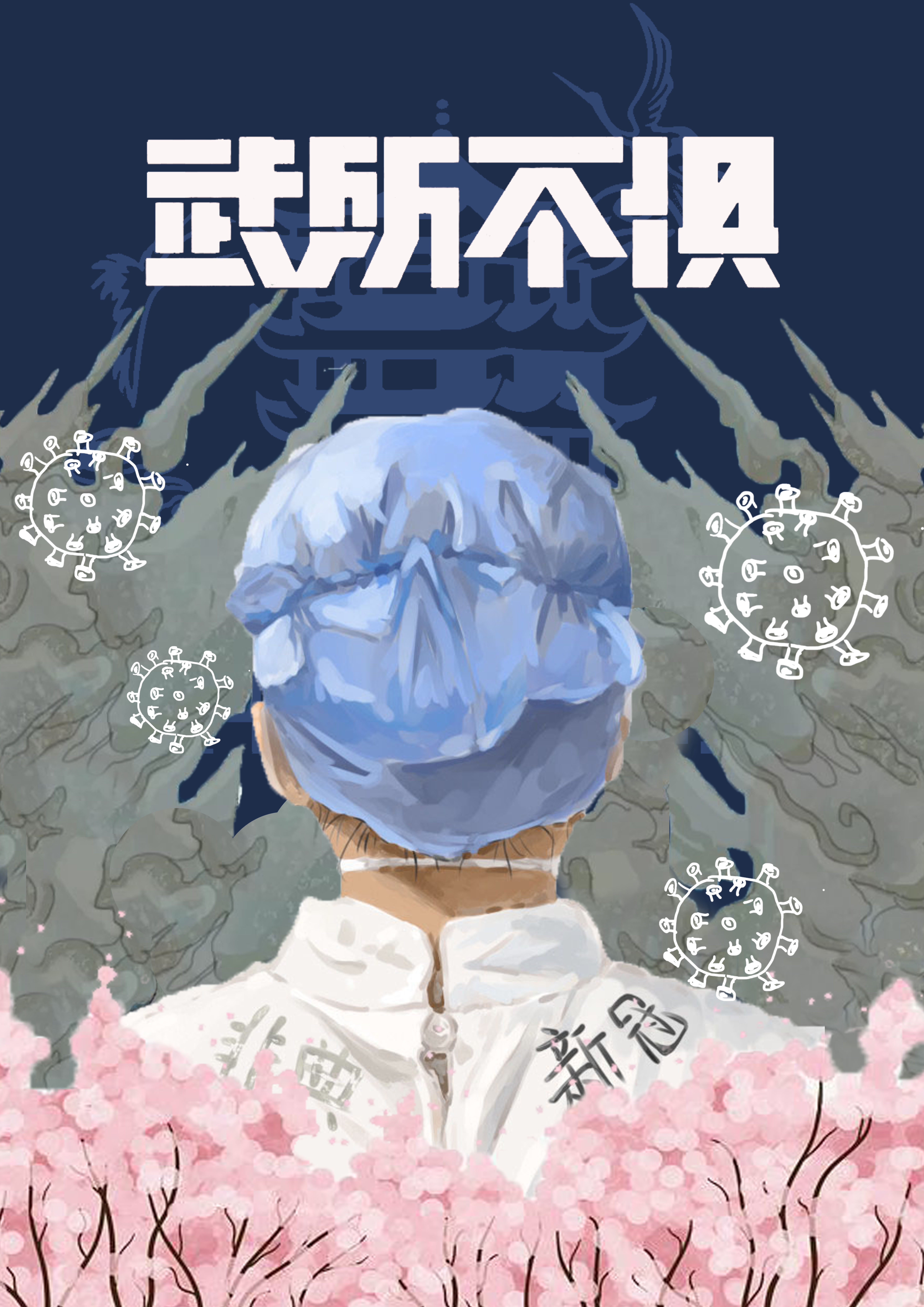 李佳明“武所不惧”设计说明:以一位武汉抗疫医生的背影为主题,她周围漂浮着新冠病毒,说明我国现在疫 情严重。上面是武汉黄鹤楼,代表武汉。医生周围是大片的盛开樱花,代表新生的希望。医生的前方是奋起的云,代表我们可以战胜病毒,赢得这场无烟的战争的胜利!武所不惧!!!