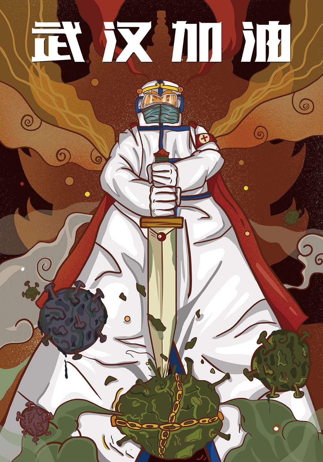 曹宇“武汉加油”设计说明:整体主题以抗击病毒为主,病毒的肆意妄为,每一个医生的见义勇为,图中医生用剑刺向病毒,背景有这次疫情的始发地武汉,以字体和画相结合,武汉加油四个字,希望能众志成城,抗击病毒。