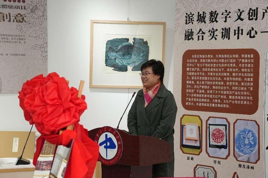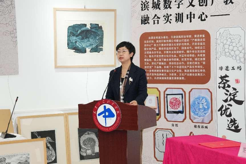 区文旅局局长贺淑荣发表了精彩的总结讲话,她高度赞扬了滨海职业学院与茶淀街道办事处产教融合的成果。贺局长指出,茶淀街道作为滨海新区唯一的市级文化产业示范区,在创意文化产业方面取得显著成绩,拥有完善文化设施、杰出人才、非遗大师及文艺队伍。滨海职业学院承载着文化传承人才培养的重任,通过产教融合平台的搭建,不仅落实了总书记视察天津时的重要讲话精神,也是文化传承发展方面的成功实践,定将为滨城非遗文化传承探索新路径。文旅局也将积极为学校搭建平台,提供更多合作机会。最后,贺局长呼吁各方携手合作,共同为四宜美丽滨城建设、文化强国及教育强国目标贡献力量。