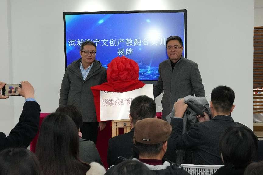 区教体局副局长吴英元、区文保旅游服务中心武志成为茶淀街道办事处、滨海职业学院、滨海印象传媒公司、荣通智慧生态农场携手共建的“滨城数字文创产教融合实训中心”揭牌。
