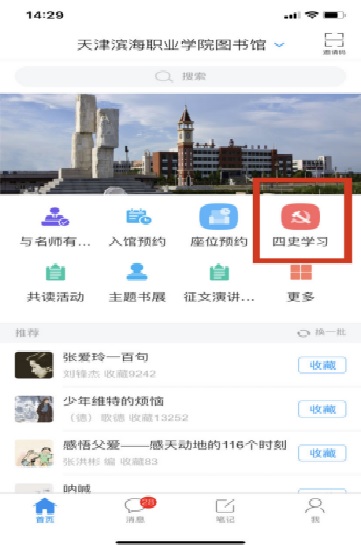 2、下载并使用手机号注册,首页点击右上角“邀请码”输入“tjbhxytsg”,进入图书馆主页面。在主页面点击“四史学习” 模块进入学习页面。