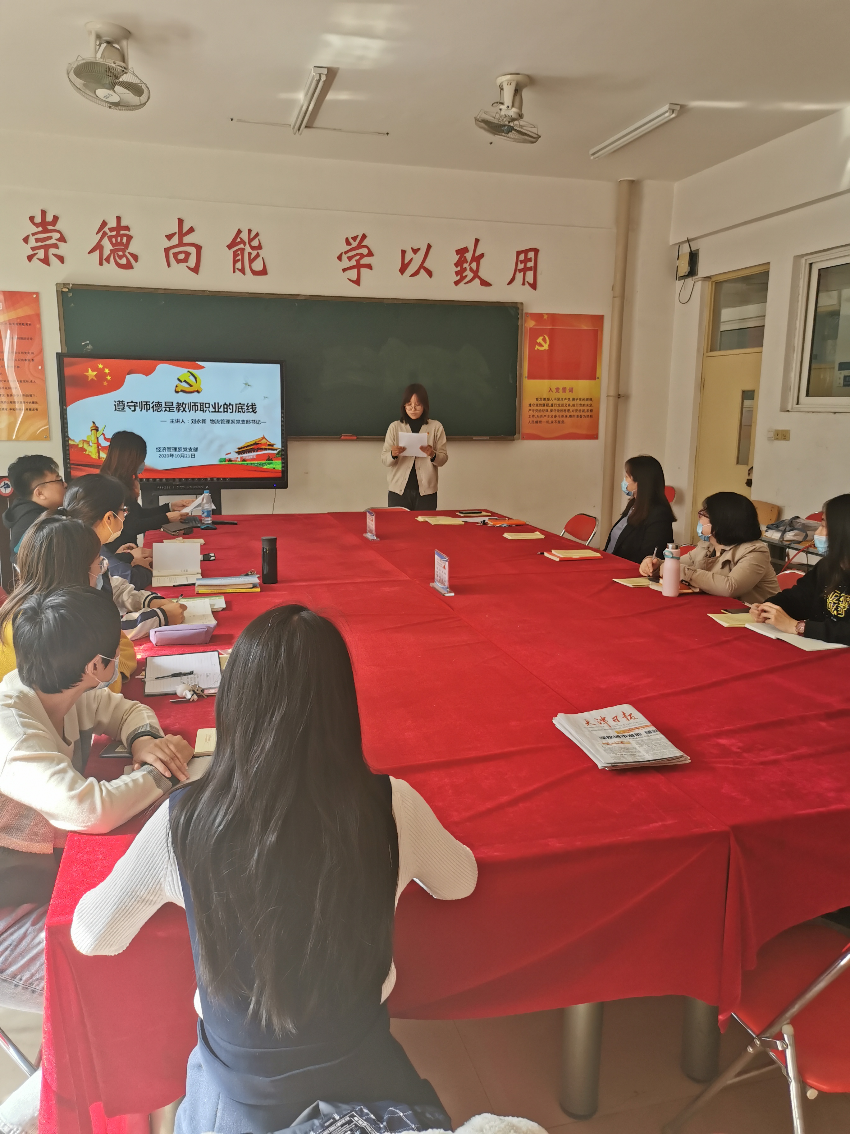 刘永新书记以“回顾党的历程,增强党员荣誉感”为切入点,指出党员老师要坚定思想信念,把好思想总开关,提高思想觉悟,提升精神境界;甘于奉献,坚持锐意进取,三尺讲台守初心,做人民满意的好老师。刘书记表示高校肩负着培养社会主义建设者和接班人的重任,要深入贯彻习近平总书记对高等教育重要指示的具体举措,牢牢把握立德树人的根本任务,持续推进习近平新时代中国特色社会主义思想进课堂进教材进头脑,为党育人、为国育才。