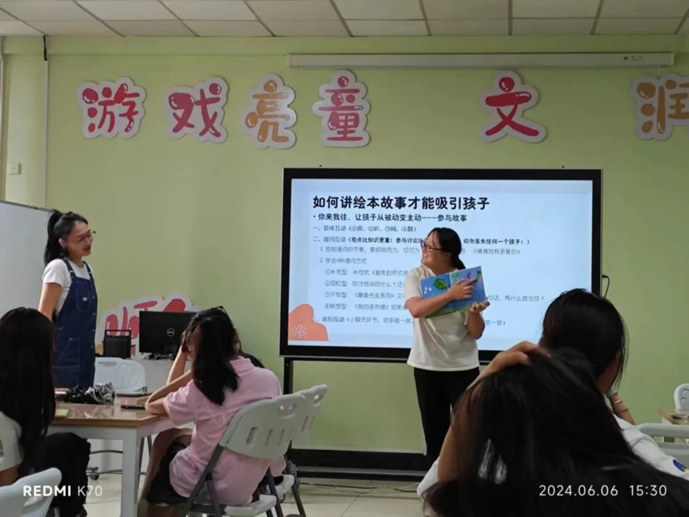24年6月6日下午,学前教育专业“故事姐姐”志愿服务队开展了一场精彩的绘本讲读讲座。讲座邀请儿童阅读指导师壹蓓子绘本馆的李姗老师开展“共探式阅读”亲自示范,同学们沉浸式的聆听并独立讲读展示,不仅提高了自身的绘本讲读技巧,更提升了专业自信和职业认知,明确了教师职业理想和就业方向。