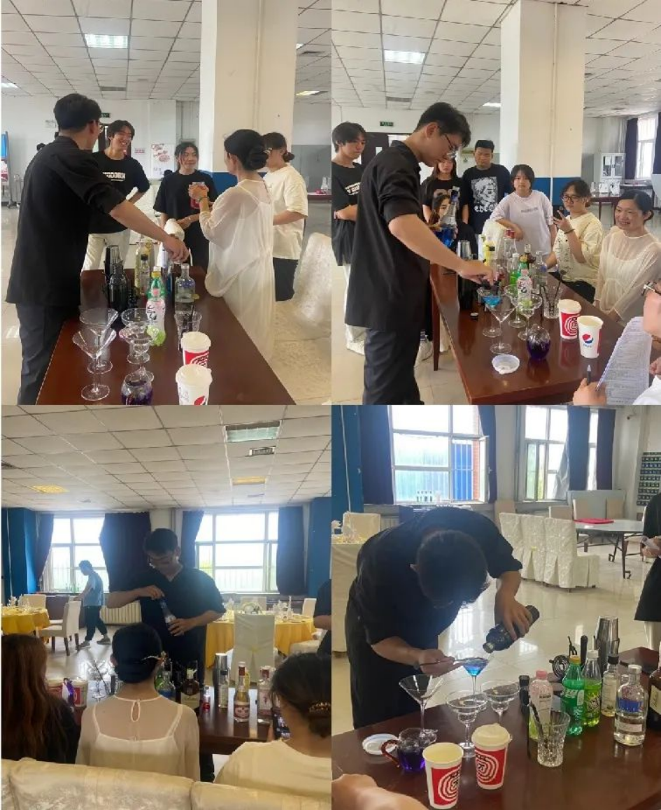 大赛尾声,大赛组委会邀请23级酒店1班的李孙飏同学,为师生展示鸡尾酒调制;鸡尾酒调制是专业技能的一大亮点,也是同学最感兴趣的一部分。