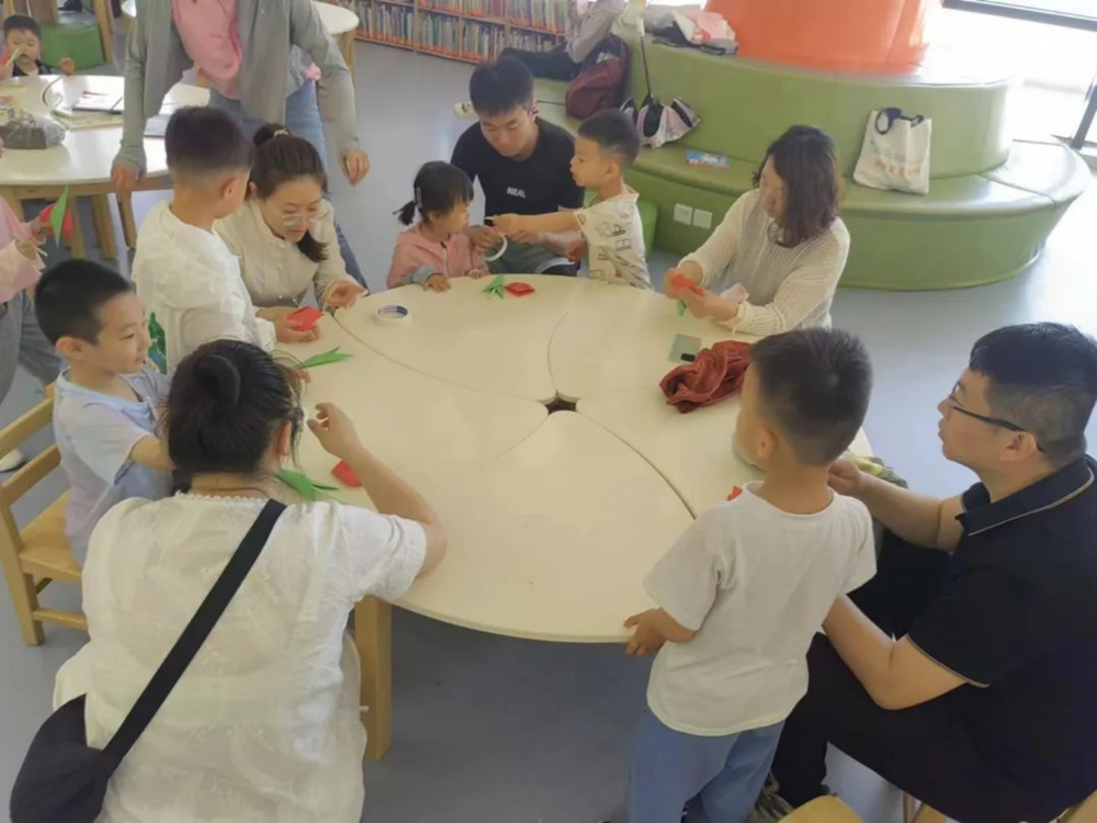 除了绘本讲述外,学前教育学生为幼儿和家长设置了互动环节。幼儿在学生和家长的指导下,动手制作了母亲节礼物—郁金香折纸,将自己的祝福和感激之情融入其中。幼儿充分发挥自己的动手能力同家长一起传递幸福。