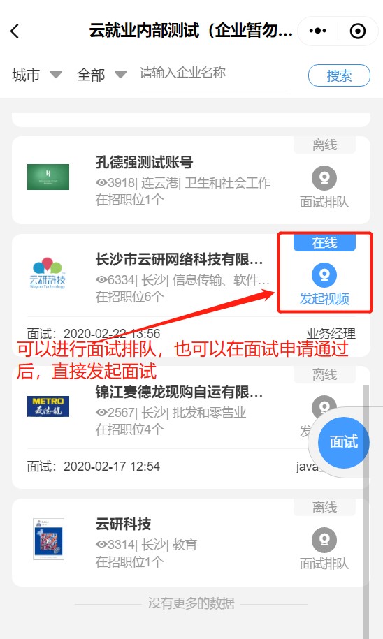 第五步:出现在“待面试”列表的内容,表明企业已经同意进行面试,可以点击详情自主发起面试(企业在线的状态下),也可以等企业发起面试(学生必须在小程序页面才能接受到邀请),面试完成后等待接收企业后期通知即可