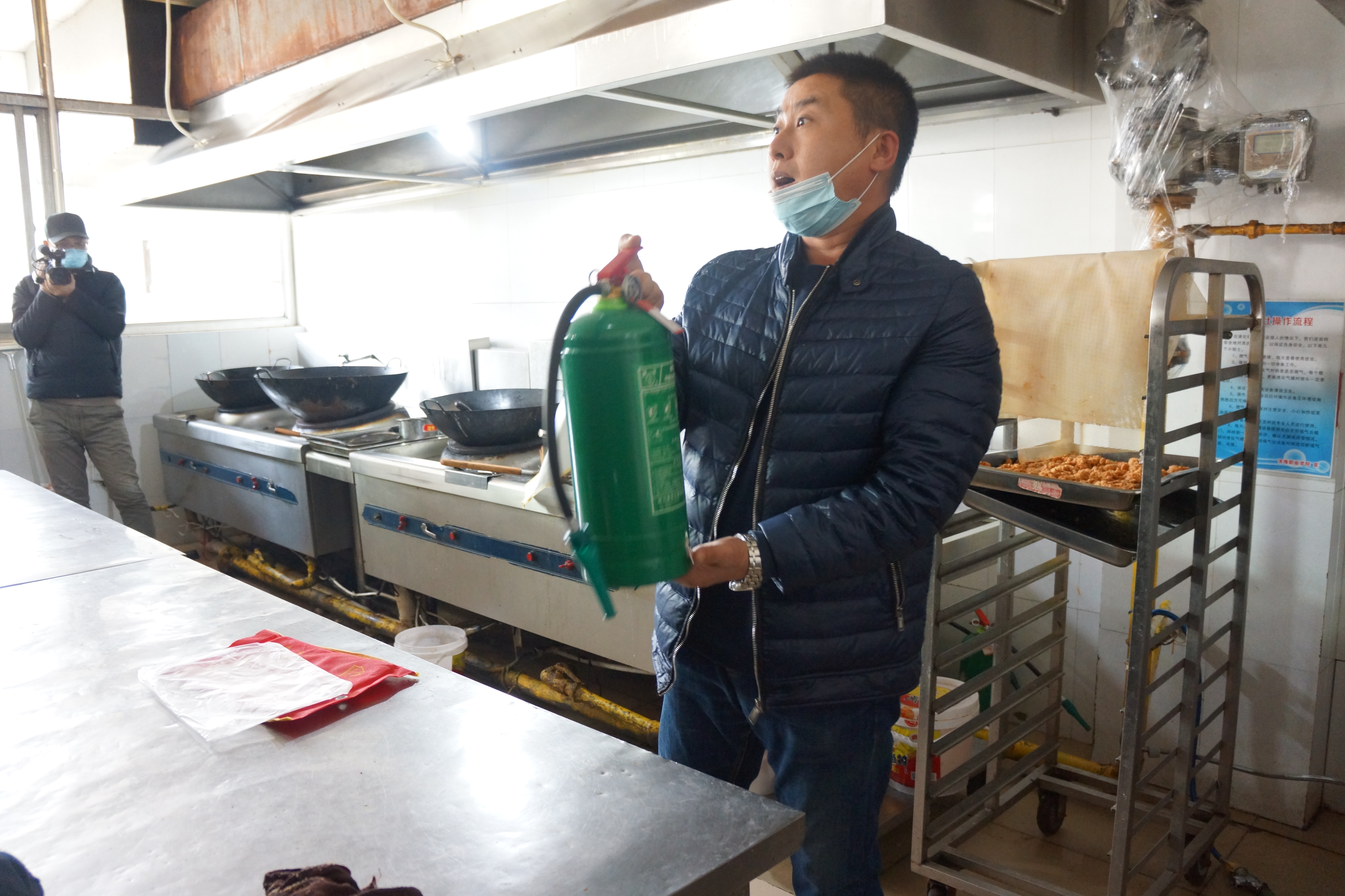 陈老师为食堂全体职工现场讲解灭火器的使用方法