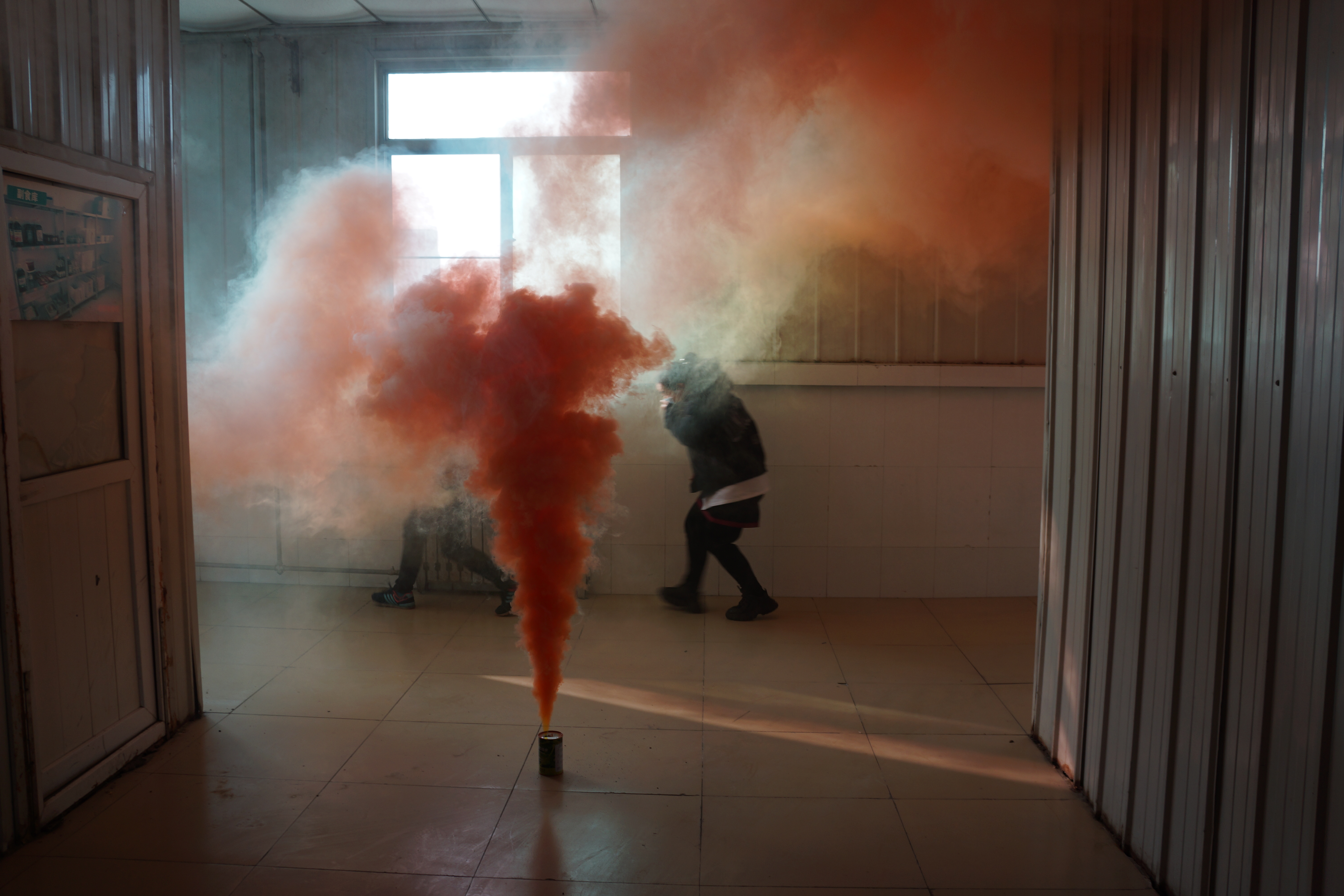 食堂工作人员在指挥下有序进行疏散演练