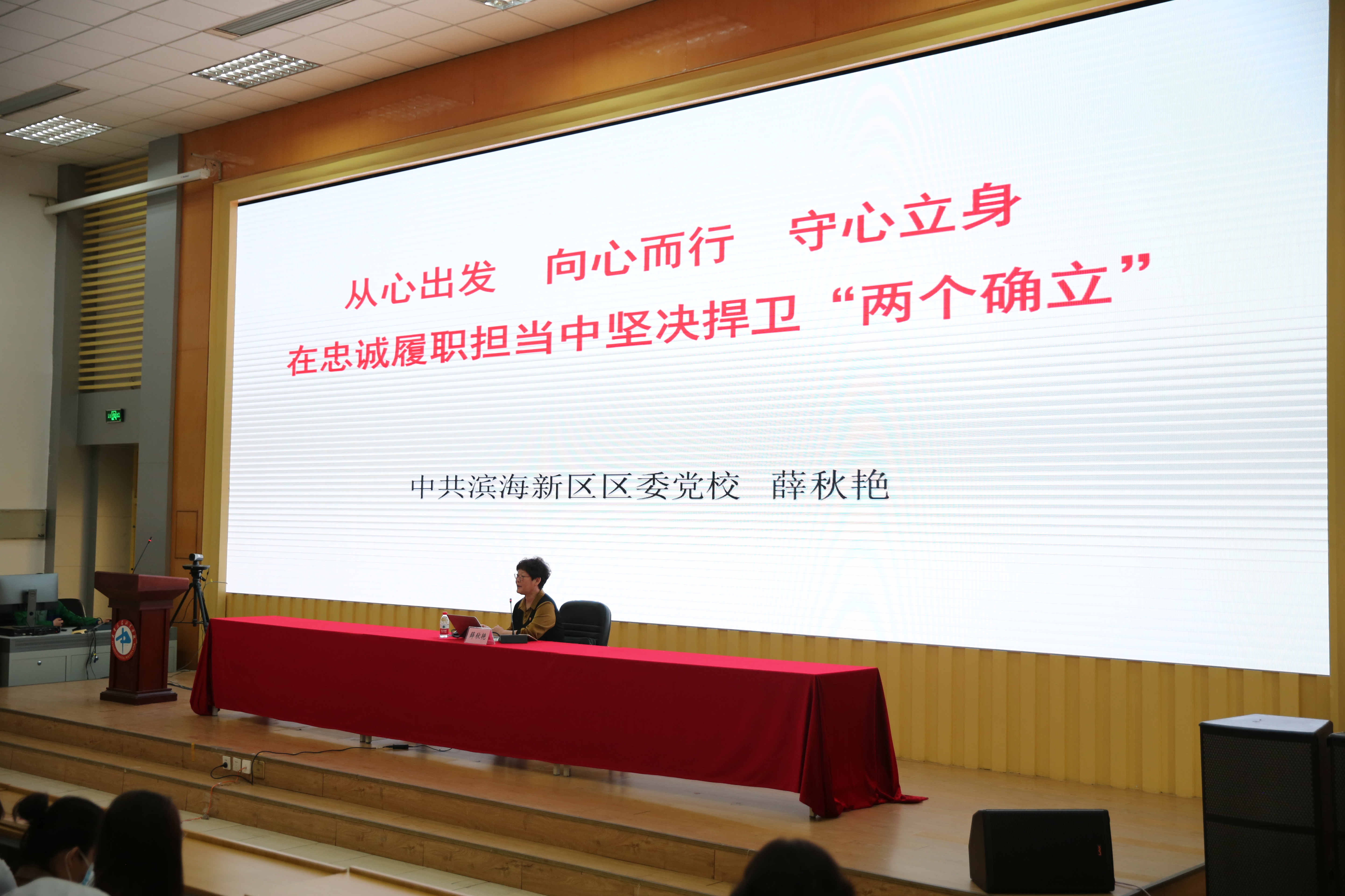 为进一步提高政治站位,筑牢政治忠诚,深入学习贯彻党的二十大精神,切实把思想和行动统一到党的二十大精神上,以忠诚担当、高度负责、昂扬向上的精神状态扎实做好各项工作,2023年5月11日下午,学校党委邀请滨海新区区委党校科研室薛秋艳主任为全体党员做了题为《从心出发 向心而行 守心立身——在忠诚履职担当中坚决捍卫“两个确立”》的专题讲座。