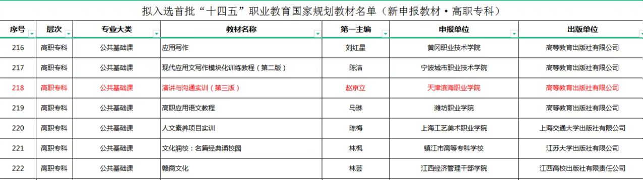 日前,教育部职业教育与成人教育司发布了《关于拟入选首批“十四五”职业教育国家规划教材名单的公示》,《演讲与沟通实训(第三版)》教材进入拟入选首批“十四五”职业教育国家规划教材名单(新申报教材·高职专科)。