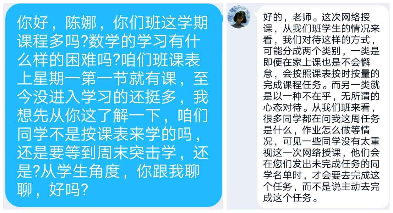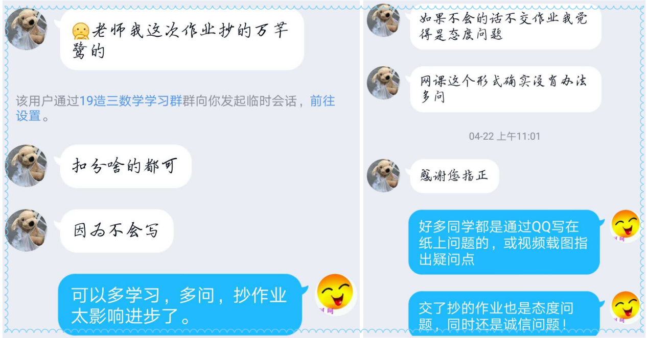 1.线上教学初期,一周两次数学课,两次数学作业,发现学生前松后紧的学习,学习作息不科学,作业提交匆忙,缺乏反复修正的过程。