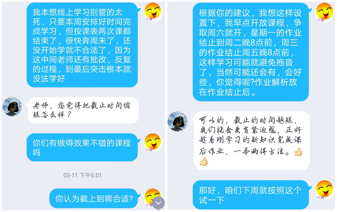 方法1:引导学生遵照课表时间,规范学习进度,设置第一次作业提交时间为第二次课之前,这样从心理上给同学增强了学习紧迫感,有效地改进了学生的学习进度。