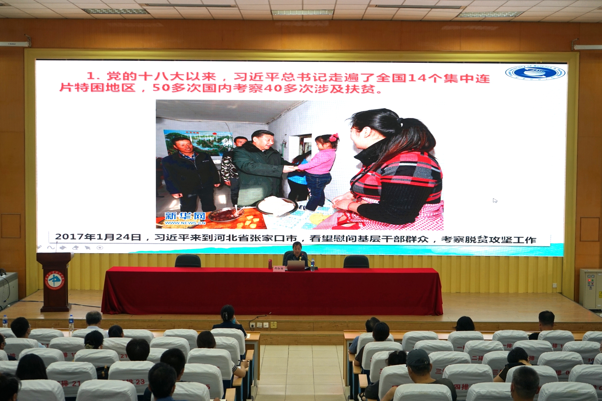 邢教授从小康路上一个都不能掉队、脱贫攻坚进展符合预期、扶贫脱贫的中国方案、不获全胜决不收兵四个方面进行主题宣讲。她引用大量案例,图文并茂、深入浅出、内容丰富,使我们对以习近平同志为核心的党中央脱贫攻坚、全面建成小康社会的战略实施背景、途径、取得的成效等有了更加全面、深刻的认识和理解。使我们更加坚定信心,在以习近平同志为核心的党中央坚强领导下,不忘初心、牢记使命,顽强奋斗,定能打赢这场对中华民族、对人类都具有重大意义的脱贫攻坚战!
