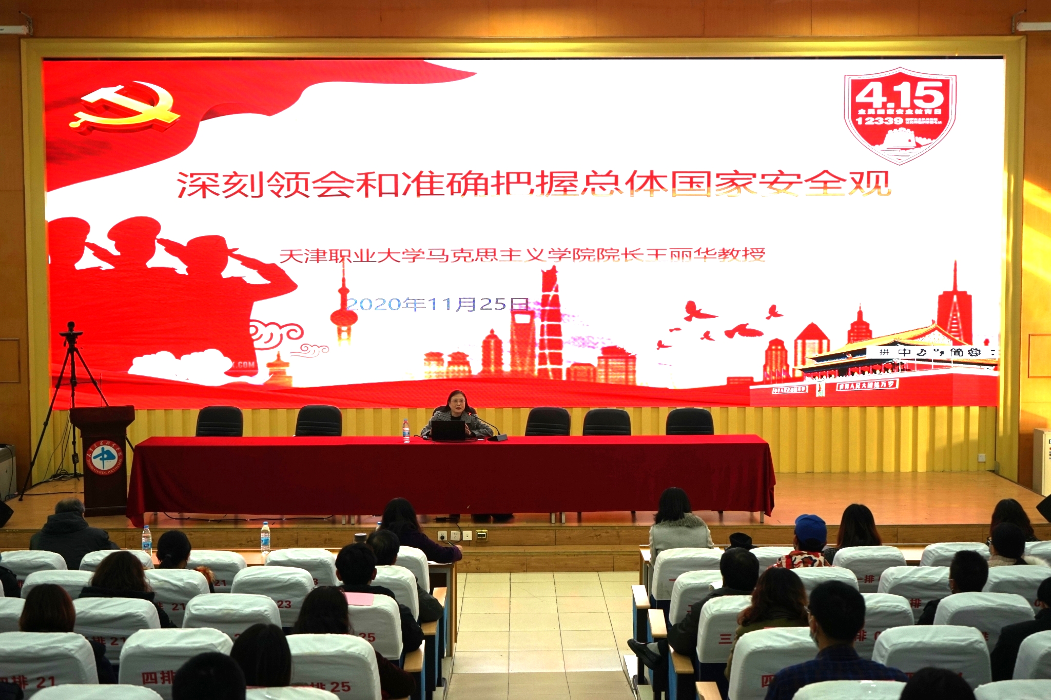 为进一步贯彻落实习近平总书记总体国家安全观,提升全院师生国家安全意识,牢固树立总体国家安全观,11月25日下午,马克思主义学院邀请“弘扬爱国奋斗精神 建功立业新时代”教授团成员天津职业大学马克思主义学院院长王丽华教授以《深刻领会和准确把握总体国家安全观》为主题,在报告厅为师生作专题讲座。学院党委书记刘雁红、党委副书记、院长杜学森、副院长王洪军、刘一波及全体中层干部、思政课教师、辅导员和相关学生代表共100余人参加。