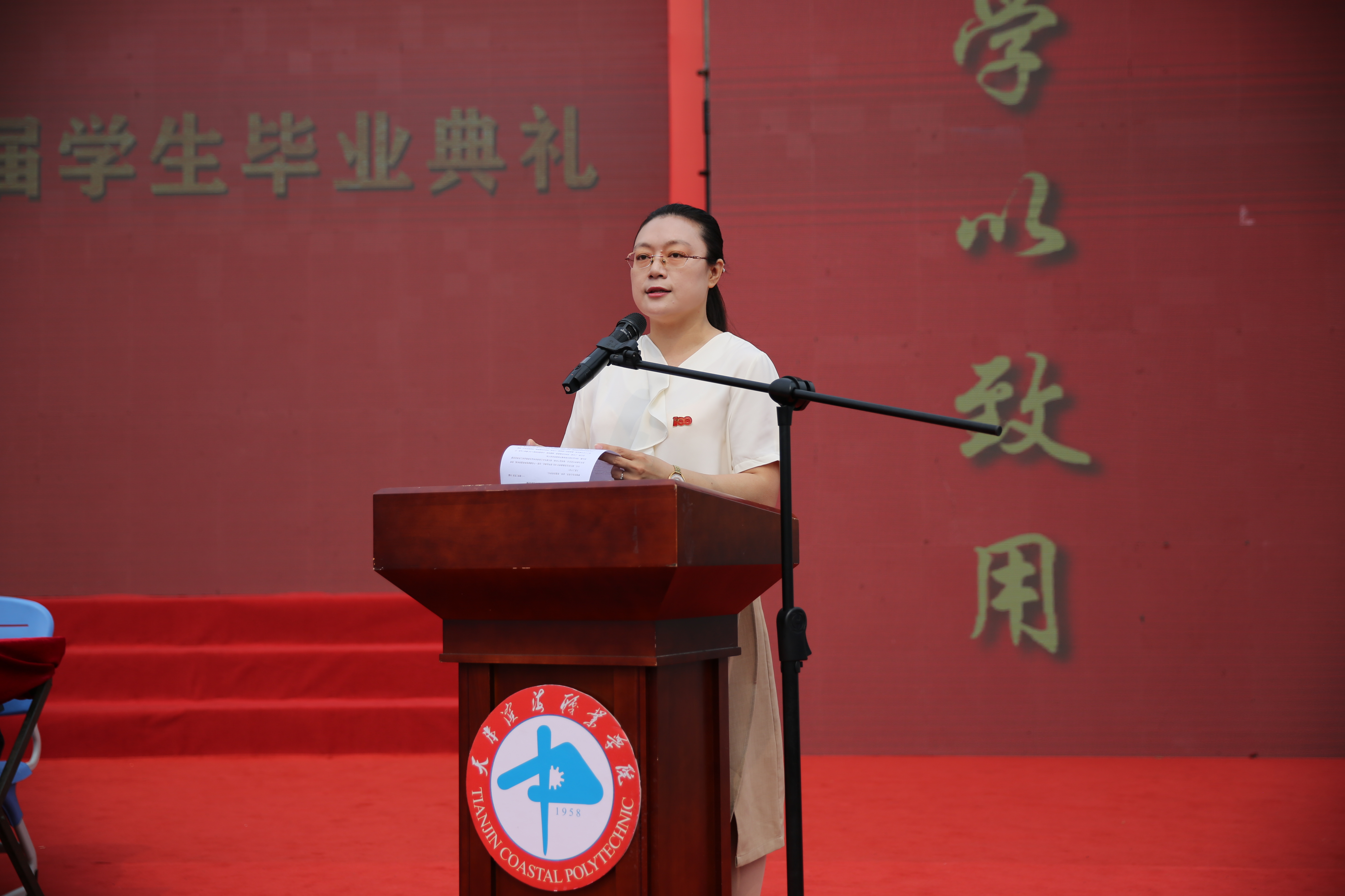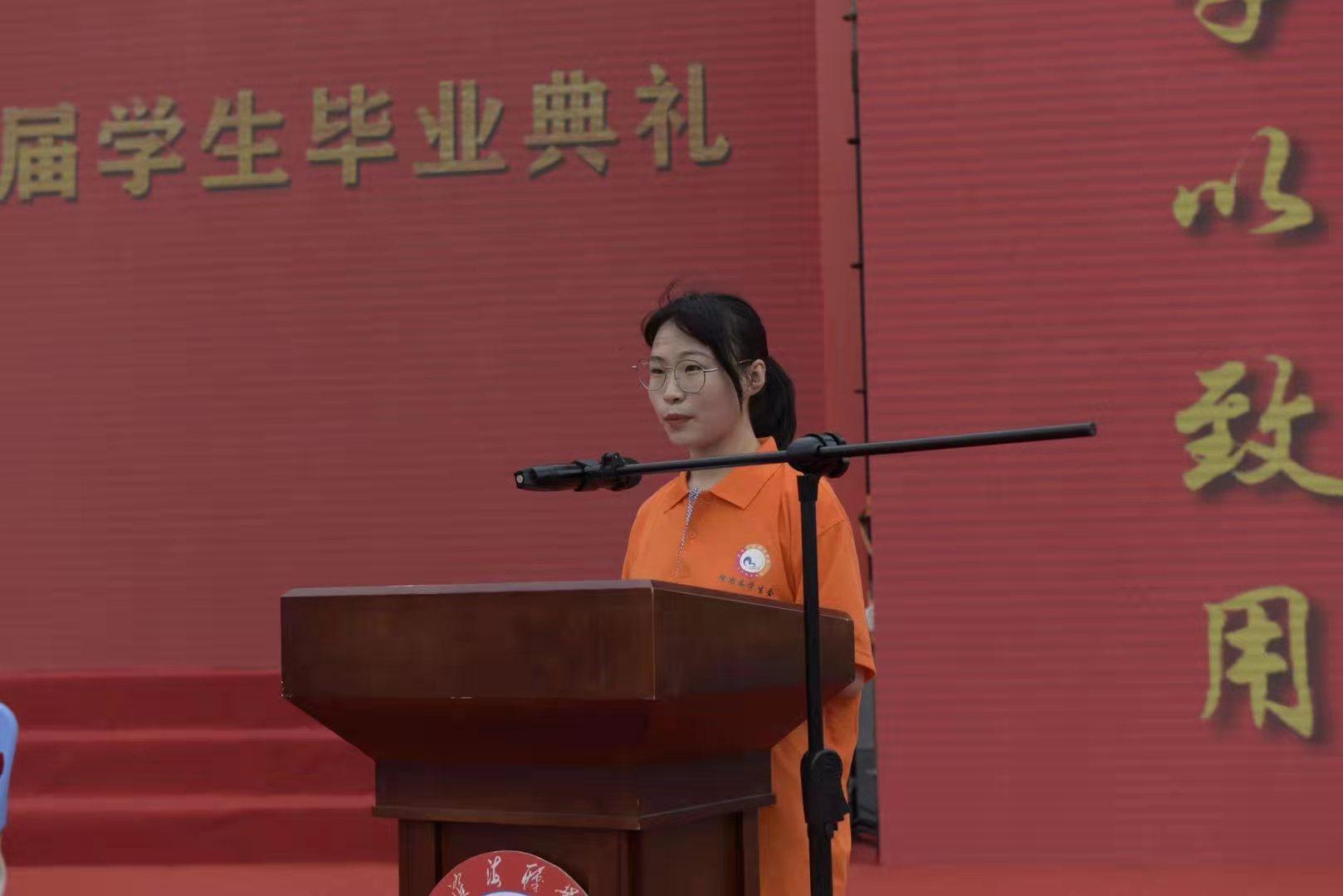 党委书记刘雁红代表学院向每一位毕业生表示热烈祝贺,并向大家提出三点希望:一、希望同学们以德立志,做有志报国的奋斗者。今后无论身处何方、从事什么职业,始终把个人发展同国家命运、民族前途紧紧联系在一起,在振兴中华的历史洪流中,把无悔的青春刻写在中华民族伟大复兴的历史丰碑上。二、希望同学们以诚立身,做追求卓越的追梦者。诚信为本,以信服人,努力成为一个可靠的人,一个高尚的人,一个卓越的人!三、希望同学们以学立本,做扎根基层的实干者。养成终身学习的习惯、不断提升学以致用的能力,在学习中再创造,秉承“执着、精技、崇德、求新”的工匠精神,脚踏实地专注做事,成为德润身、技立世、品高端的深受欢迎的高素质技术技能人才,为职教人添彩。刘书记致辞满含深情、语重心长,现场不断响起热烈的掌声。