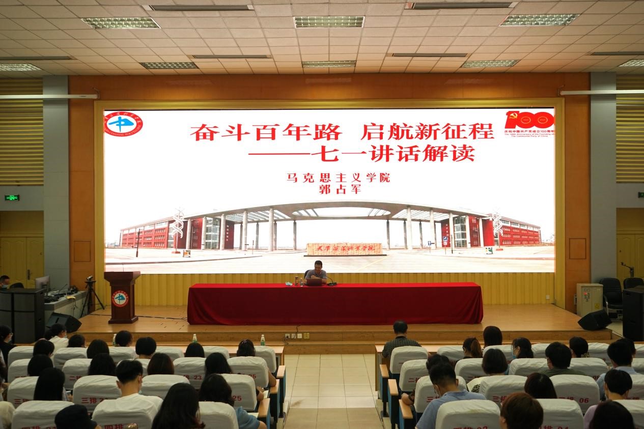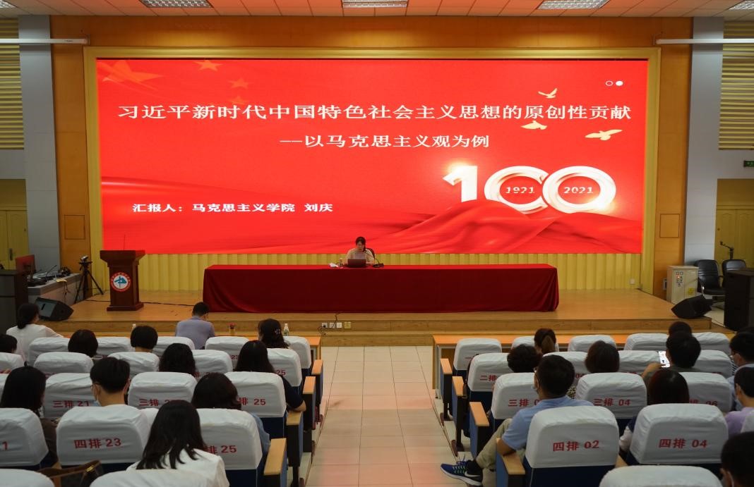 马克思主义学院郭占军老师和刘庆老师分别为全体党员教师进行了宣讲。郭占军宣讲的主题是《奋斗百年路启航新征程——七一讲话解读》,他分别从总体评价、逻辑结构、理论创新三方面对《习近平总书记在庆祝中国共产党成立100周年大会上的重要讲话》进行解读。