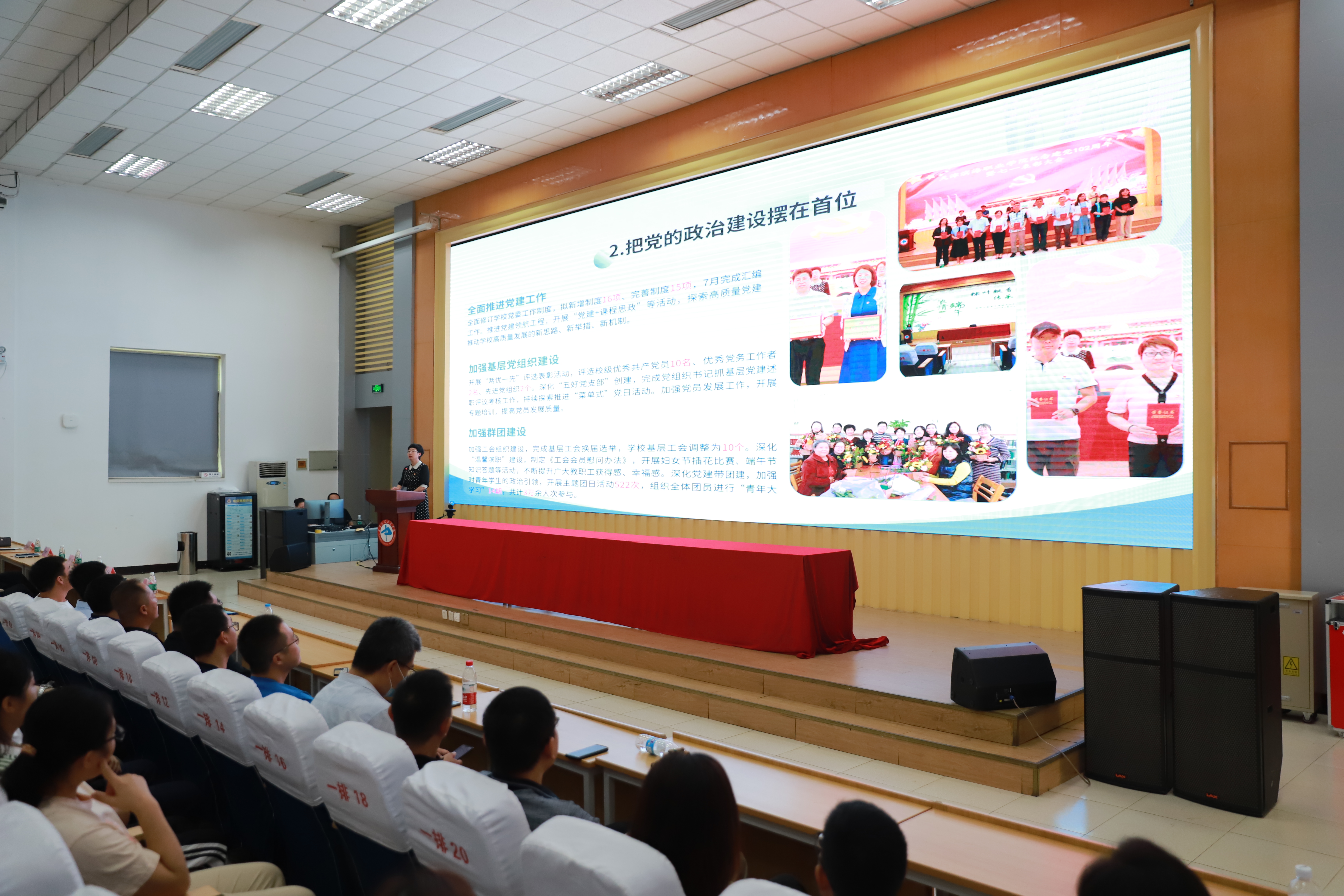 党委书记王建枝作重要讲话,她从七个方面全面总结了学校2023年上半年24项主要党政工作。建枝书记指出2023上半年学校以习近平新时代中国特色社会主义思想为指导,全面贯彻党的二十大精神,坚定捍卫“两个确立”,坚决做到“两个维护”,按照市第十二次党代会和新区第四次党代会部署要求,加强党对学校工作的全面领导,全面贯彻党的教育方针,以立德树人为根本,以服务经济社会发展需求为导向,以深化现代职业教育体系建设改革为主线,深化产教融合,强化师资队伍建设,提升关键办学能力,推进新校区建设,在人才培养关键环节改革、治理能力现代化、服务新区产业发展能力提升等方面取得了新突破,为年度重点工作目标的顺利实现奠定了良好基础。