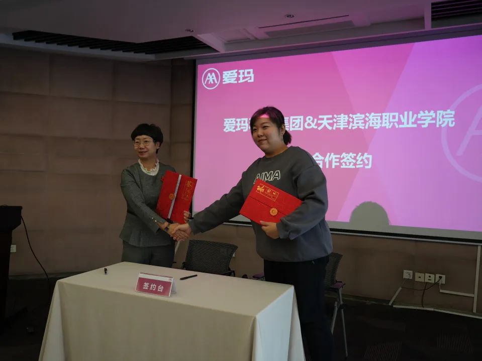 滨海职业学院党委书记王建枝和爱玛科技集团首席人才官李娜分别代表校企双方进行校企合作框架协议签约。
