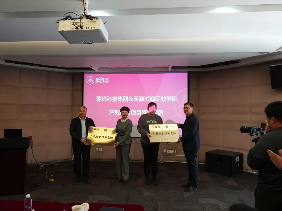 滨海新区教体局副局长吴英元、静海区人社局副局长王贺起分别向爱玛科技集团股份有限公司和必赢线路检测中心授予“产教融合项目基地”铜牌。