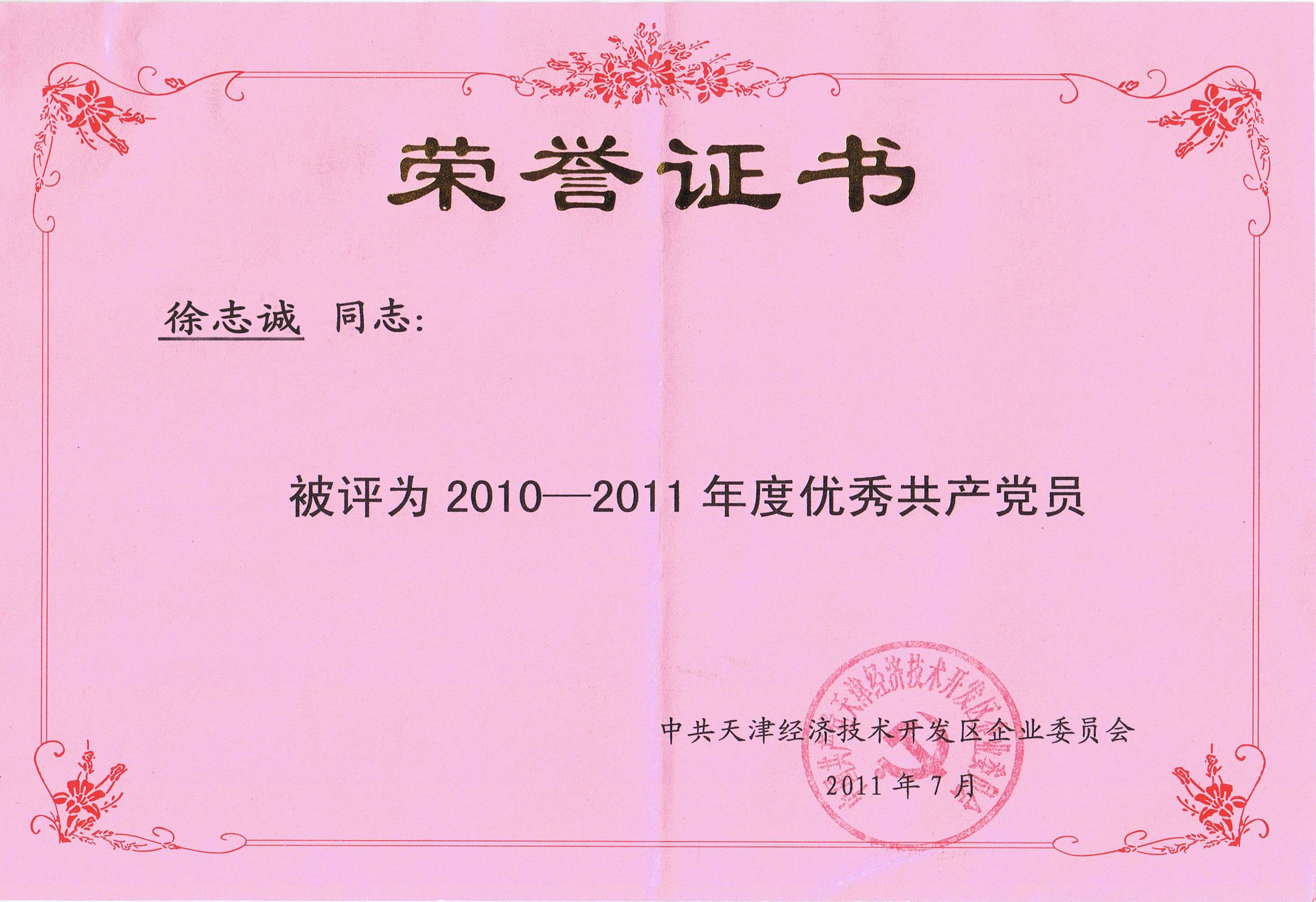 2010–2011年度被天津市经济技术开发区企业党委评为“优秀共产党员”。