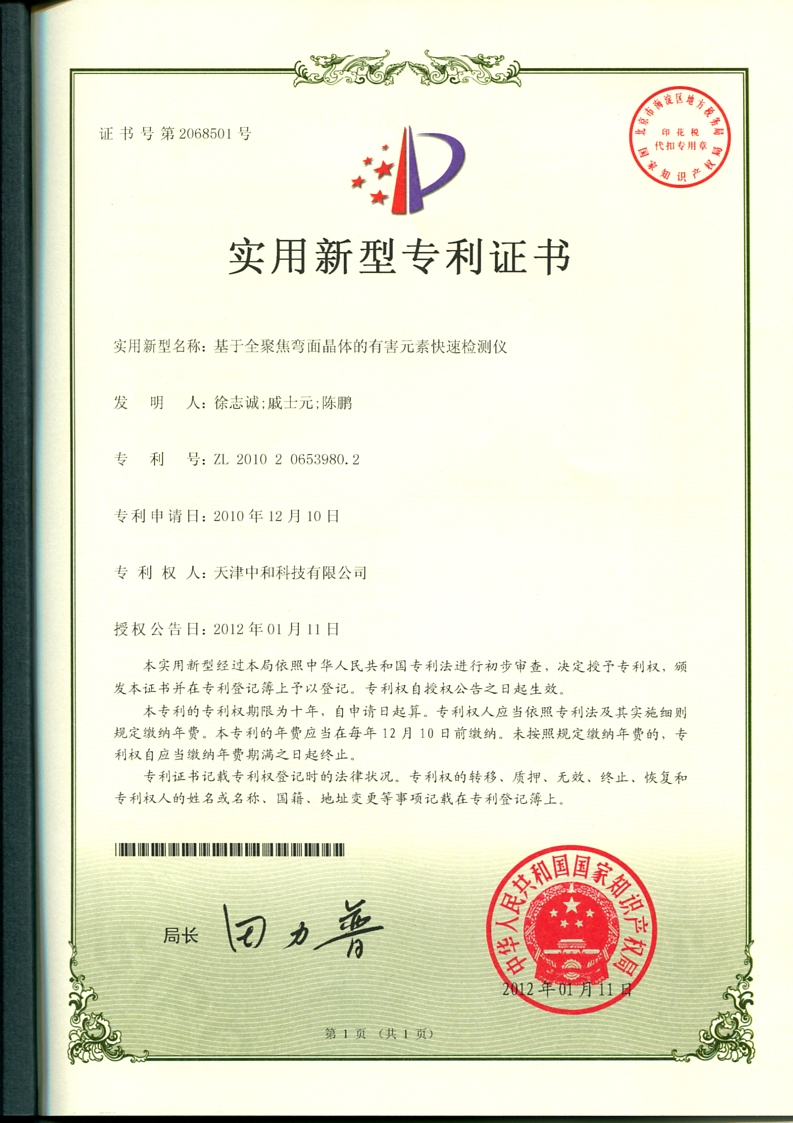 2012年1月申请的实用新型专利《基于全聚集弯面晶体的有害元素快速检测仪》获得了国家授权。