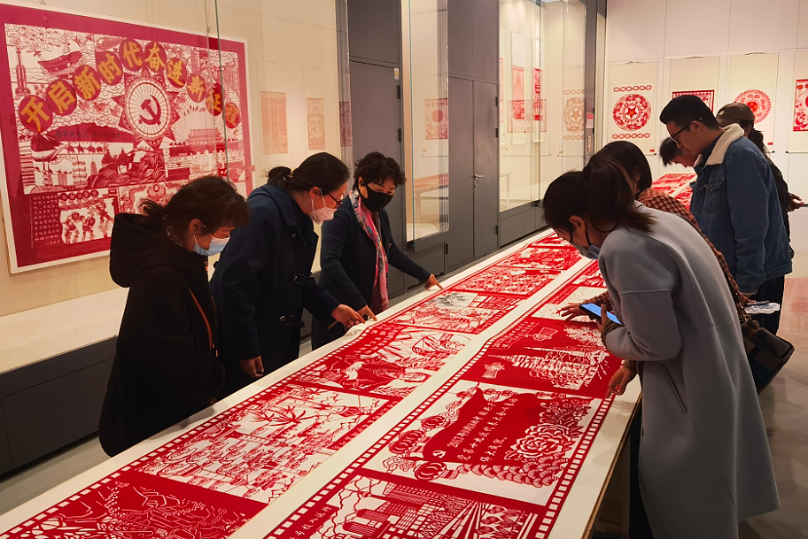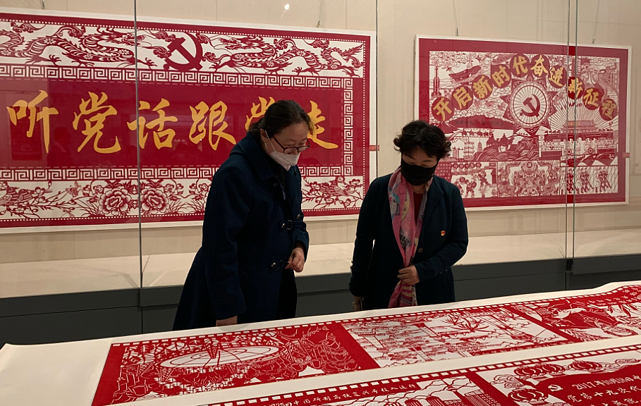 来到“前进!向着光荣和梦想的新征程”——滨海新区学习宣传贯彻党的二十大精神剪纸作品展厅,由“大港剪纸”“塘沽剪纸”非遗项目传承人带头创作的130余幅精品剪纸作品依次排开,创作者们将喜庆吉祥的传统剪纸元素巧妙地与党的一大到二十大发展历程中的重要时刻相结合,浑然天成,充满意趣,充分体现了滨城剪纸技艺的特有魅力。