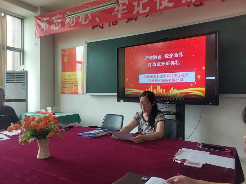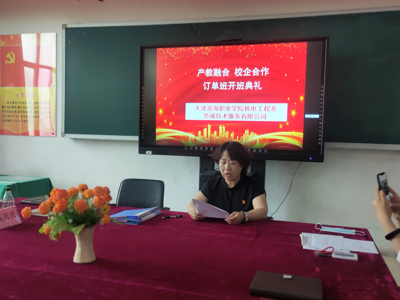 首先机电系书记、主任刘秋艳致辞,她对订单班成功开班表示祝贺,向企业领导参加开班典礼表示欢迎,向合作企业一学期来将岗前培训前置进课堂付出的辛苦表示感谢,并对同学们提出了三点要求:一是希望同学们努力学习,珍惜机会,履行“华威准员工和滨海学院学生”的双重职责,自觉遵守企业和学校的各项规章制度,尊敬师傅,虚心学习,不断提高自己的技能水平和职业道德素养。二是注意交通安全、工作安全。安全是1,其他都是0,只有安全的1摆在第一位,那么其他的活动才有意义。三是希望企业和学校能以此为起点,拓宽合作领域,加大合作力度,争取更多合作。