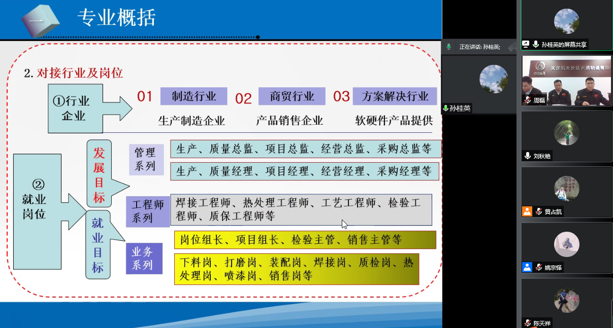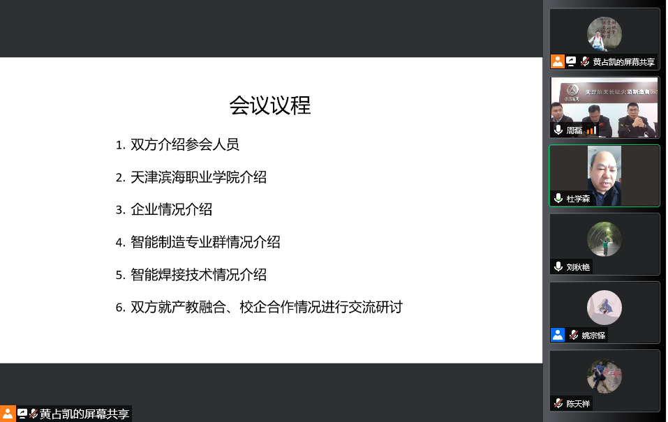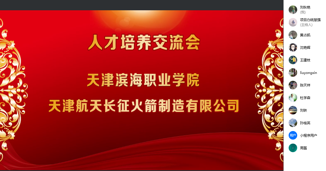为全面贯彻落实教育部、天津市人民政府《关于深化产教城融合,打造职业教育创新发展标杆的意见》,学院智能制造专业群紧跟天津职业教育创新发展的快车道,主动融入滨海新区“1+3+4”产业内涵建设,积极探索校企合作人才培养的创新发展之路。2022年3月25日,在中国教育在线编辑黄占凯老师牵线组织下,学院与天津航天长征火箭制造有限公司以线上会议方式,共同研讨产教融合、校企合作人才培养相关事宜。天津航天长征火箭制造有限公司 人力资源处处长王兴友 焊接车间主任高文静 副主任刘含伟 、项目办姚慧强、姚宗泽、刘轶 相关 领导以及 学院党委书记王建枝、党委副书记、院长杜学森和教务处及机电工程系部门领导、焊接 教研室主任老师参加了研讨会。会议由 机电系副主任沈艳辉 主持。