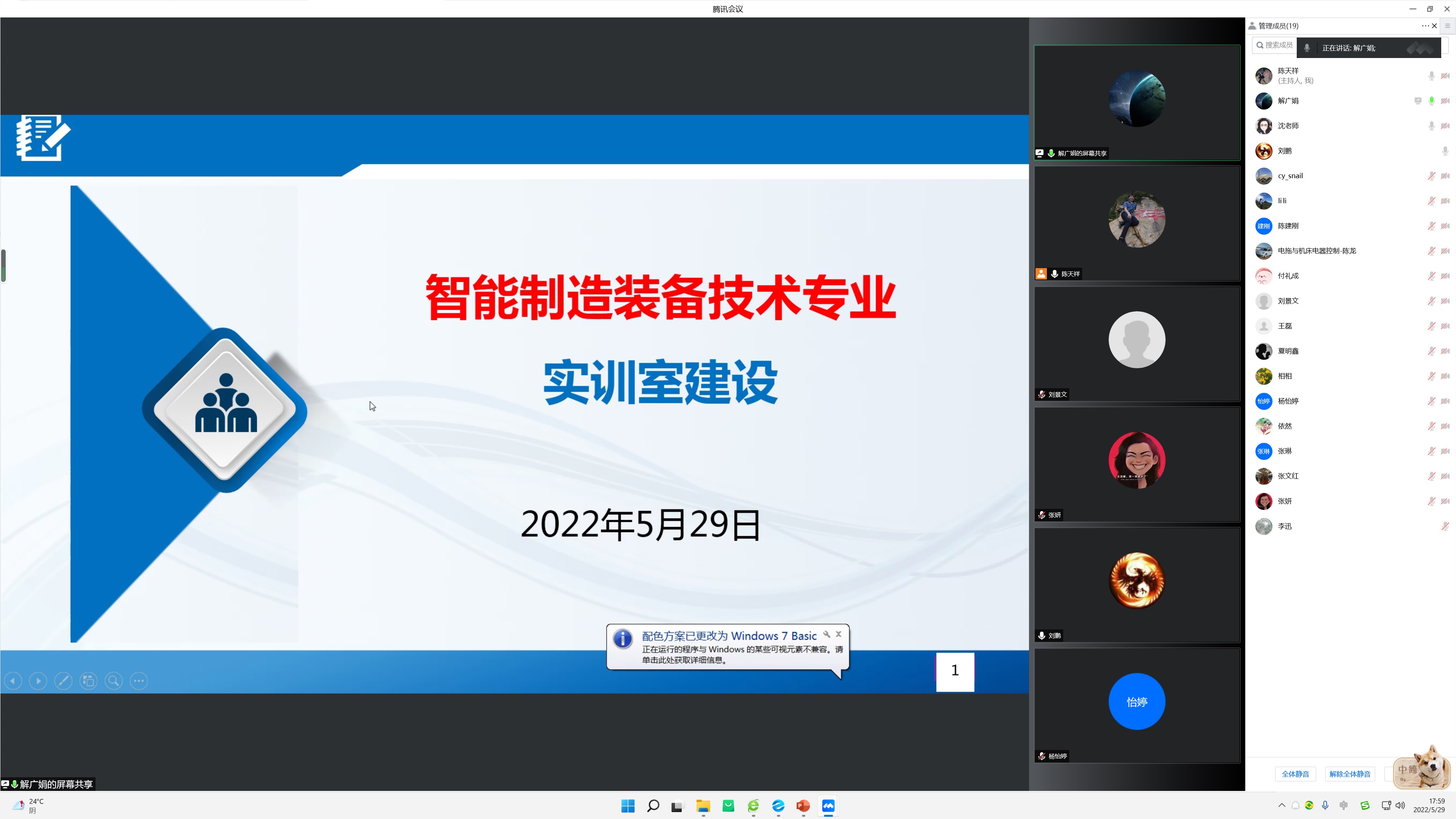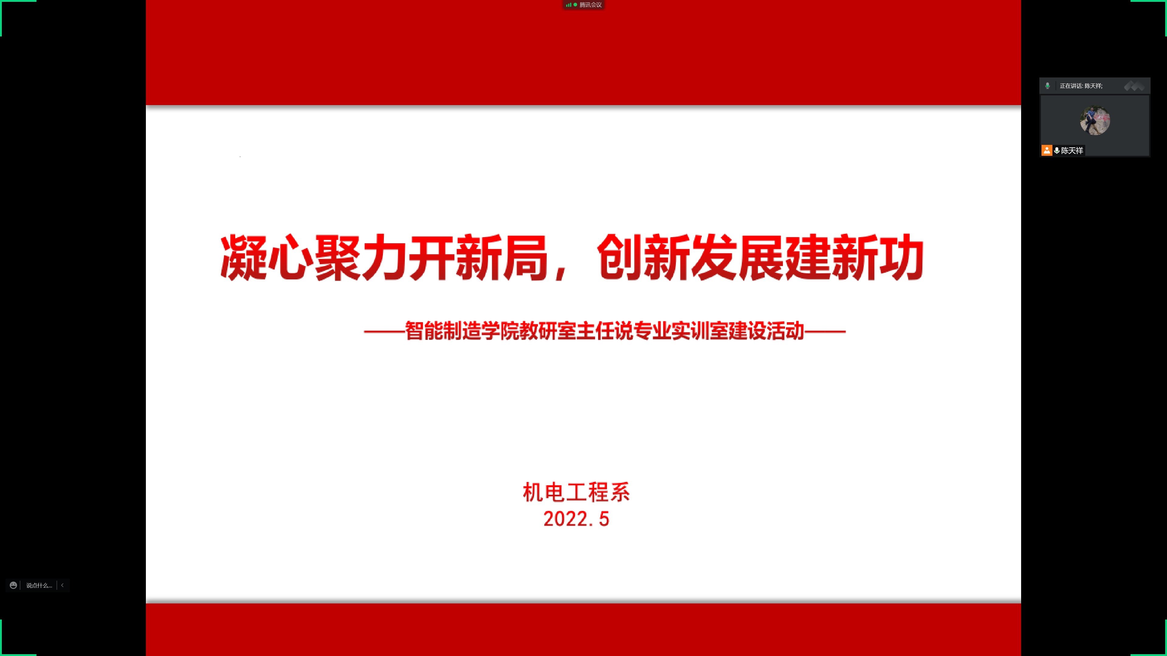 2022年5月29日,智能制造学院通过腾讯会议的方式,组织开展了“教研室主任说专业实训室建设”活动。活动由陈天祥主持,智能制造学院班子成员、各专业负责人、支部委员会委员及全体专业教师均参加了此次活动。